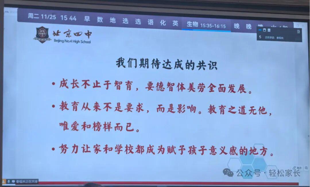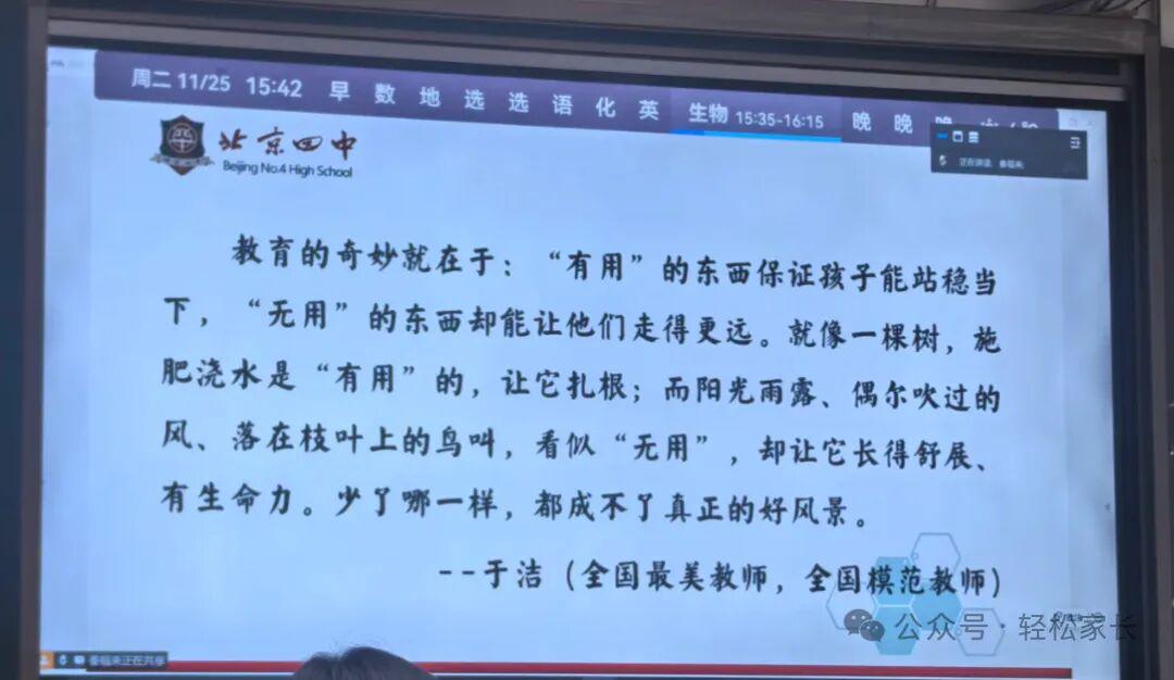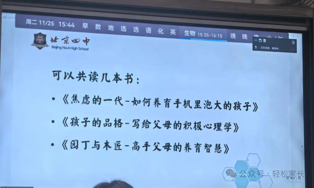有温雅网友共享了北京四中家长会现场图片,对 “幽闲涵养对错”“‘四无’后生即没一又友、没酬酢、没空想、没阵势成因” 等家长高频困惑进行了解答。