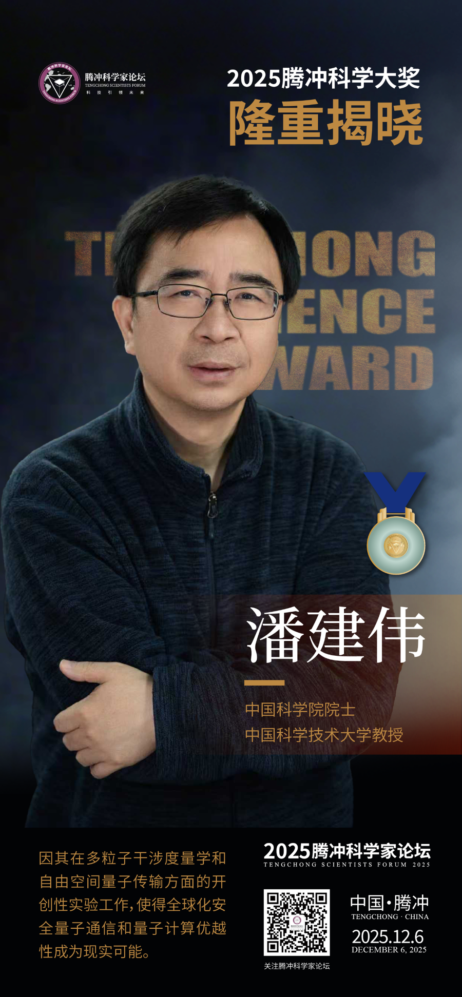 今天(6日)上昼,2025腾冲科学家论坛开幕式在腾冲科学礼堂举行,备受科技界瞩辩论2025腾冲科学大奖认真揭晓。中国科学院院士,中国科学时代大学陶冶潘建伟获此盛誉,获奖事理是:因其在多粒子干与度量学妥协脱空间量子传输方面的始创性实验责任,使得大家化安全量子通讯和量子辩论优胜性成为推行可能。